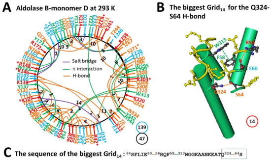 The grid-like non-covalently interacting mesh network along the single polypeptide chain of ligand-free monomer D in the aldolase B tetramer at room temperature (293 K). (A) The topological grids in the systemic fluidic grid-like mesh network. The X-ray crystallographic structure of monomer D in aldolase B at room temperature (293 K) (PDB ID, 1QO5) was used for the model [9]. Salt bridges, π interactions, and H-bonds between pairing amino acid side chains along the single polypeptide chain from Q9 to S352 are marked in purple, green, and orange, respectively. The grid sizes required to control the relevant non-covalent interactions were calculated and labeled in black. The total grid sizes and grid size-controlled non-covalent interactions along the single polypeptide chain are shown in the blue and black circles, respectively. (B) The structure of the biggest Grid14. The grid size is shown in a red circle. (C) The sequence of the biggest Grid14 to control the S64-Q324 H-bond in a blue box.
