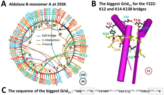 The grid-like non-covalently interacting mesh network along the single polypeptide chain of ligand-free monomer A in the aldolase B tetramer at room temperature (293 K). (A) The topological grids in the systemic fluidic grid-like mesh network. The X-ray crystallographic structure of monomer A in aldolase B at room temperature (293 K) (PDB ID, 1QO5) was used for the model [9]. Salt bridges, π interactions, and H-bonds between pairing amino acid side chains along the single polypeptide chain from T8 to H344 are marked in purple, green, and orange, respectively. The grid sizes required to control the relevant non-covalent interactions were calculated and labeled in black. The total grid sizes and grid size-controlled non-covalent interactions along the single polypeptide chain are shown in the blue and black circles, respectively. (B) The structure of the biggest Grid11. The grid size is shown in a red circle. (C) The sequence of the biggest Grid11 to control the K12-Y222 CH-π interaction and the E14-K138 H-bond in blue boxes.