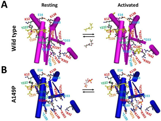 Since the dynamic active site is coupled to the stable Grid11 anchor, it is reasonable that any structural perturbation at either site by a mutation may affect the catalytic activity. In agreement with this notion, some missense K146 mutants have a marked decline in catalytic activity [20,21,22], the R303A/W/Q or W147R mutation affects the kcat and Km values for Fru-1,6-P2 [18,23,24,25], the deletion of nearby residues L182 and V183 or the nearby A174D mutation in HFI patients reduces the enzyme activity [23,26,27], and W147R and A174D are also associated with HFI [27,28]. Upon the A149P mutation, the disruption of the native β-strand structure at position 149 caused the disruption of the R148-E189 salt bridge and other structural perturbations at critical positions R148, E189 and R303 and other disordered loop regions (Figure 3A and Figure 4A). As a result, the orientation rearrangements of E189 and R303 enlarges the binding pocket so that the C1-phosphate-binding site of AP-aldolase is distorted in a temperature-independent manner (Figure 7) [1,2,9]. This loose pocket may disfavor the ligand binding so that the activity is weakened [1].