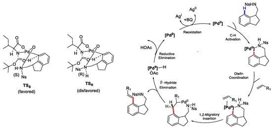 Nosylamide substrate (0.1 mmol), styrene or substituted styrene (3.0 equiv), Pd(OAc)2 (0.2 equiv), Boc-L-lle-OH (0.4 equiv.), AgOAc (2.5 equiv.), K2CO3 (2.5 equiv.), BQ (0.5 equiv.) and H2O (2.0 equiv.) were added to a sealable Schlenk tube and a solution of anhydrous NMP (0.5 mL) in anhydrous t-AmOH (1.5 mL). The Schlenk tube was sealed, and the mixture was stirred vigorously at 60 °C. After 24 h, the reaction was cooled to room temperature, dichloromethane (DCM) was added (5 mL), and the reaction was filtered through a pad of Celite over a plug of silica gel and eluted with DCM (30 mL). The organic layer was washed twice with water, dried over anhydrous sodium sulfate (Na2SO4), filtered, and concentrated under reduced pressure. The crude material was purified by silica gel column chromatography to obtain the Chiral alkenylation products as white or pale-yellow solids.