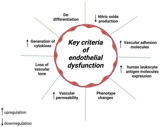 The endothelial cell (ECs) defect that alters regular vascular homeostasis is often referred to as endothelial dysfunction (ED) [9]. In 1998, Hunt and Jurd set the essential criteria (Figure 1) that define endothelial dysfunction, i.e., (i) upregulation of adhesion molecules, (ii) loss of vascular tone, (iii) phenotype changes, (iv) generation of cytokines, and (v) higher human leukocyte antigen molecules expression [10]. Alexander et al. had recently refined multi-spectrum phenotypes involved in endothelial dysfunction, such as inflammation, de-differentiation, loss of vascular integrity, and permeability [11]. Dysfunctional endothelium decreases nitric oxide (NO) production and subsequently disrupts the vasorelaxation [12]. ECs are also involved in the pathogenesis of atherosclerosis by secreting pro-inflammatory cytokines and platelet-adhesion molecules which reduce vascular wall permeability and thus, permit entry of oxidized lipoproteins and inflammation mediators [13,14,15].