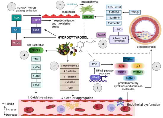 Summary of biomolecules and molecular pathways regulated by hydroxytyrosol in endothelial functioning. (1) HT activates PI3K/AKT/mTOR in re-endothelisation and Nrf2/HO-1 expression in promoting re-endothelisation and decreasing oxidative stress. (2) HT inhibits TGF-β-induced EndMT transition. (3) HT regulates the reverse cholesterol transport pathway by increasing (ABCA1) and decreasing FMO3. (4) HT suppresses oxidative stress by activation of SIRT1. (5) HT lowers platelet aggregation by suppressing adhesion molecules. (6) HT inhibits NF-kβ-induced ROS which subsequently triggers the production of pro-inflammatory cytokines and adhesion molecules. (7) HT inhibits the production of pro-inflammatory cytokines and adhesion molecules that promotes atherosclerosis.