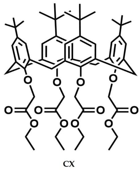 tetra(ethoxycarbonyl-methoxy)-4-tert-butylcalix[4]arene (CX) was synthesized by following a procedure found in the literature [23]. In brief, the commercial 4-tert-butyl-calix[4]arene was treated with bromo-ethylacetate in the presence of potassium carbonate (molar ratio 1:10:10) in acetone as a solvent. CX was characterized by 1H NMR spectrum whose signals (Figure S1) were consistent with the structure depicted in Figure 1.
