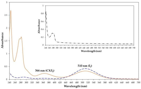 UV-vis spectra of iodine (1.3 × 10−3 M, dashed blue line), CX/iodine 1:1 molar ratio (solid orange line), and CX alone (inset) in chloroform at 25 °C.