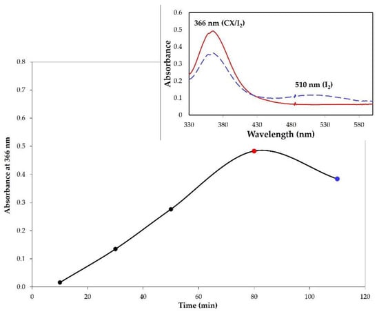 Monitoring of the CX/iodine complex formation by solid–air method. The graphic reports the absorbance values of the complex (λ = 366 nm) as a function of time. Inset: UV-vis spectrum in chloroform of CX/iodine complex after 80 min (solid red line) and 100 min (dashed blue line).