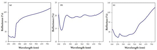 Reflectance (%) spectra of the (a) CX, (b) iodine, and (c) CX/iodine complex powders.
