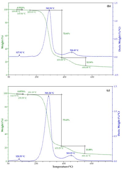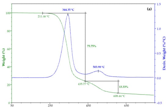 Thermogravimetric analyses (TGA) were performed using a thermogravimetric apparatus TGA Q500 (TA instruments, New Castle, DE, USA) under a nitrogen atmosphere at a 10 °C/min heating rate, from 50 °C to 800 °C. Sample weight was approximately 5 mg. The weight loss percent and its derivative (DTG) were recorded as a function of temperature.
