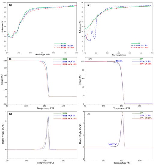 Reflectance (%) spectra, TGA, and DTG of (a–c) HDPE and (a’–c’) PP films, empty (green line) and embedded with CX (blue and red lines).