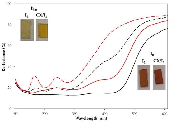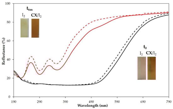 Reflectance (%) spectra of PP polymer films loaded with iodine (red lines) or CX/iodine complex by vapor method (black lines) at t0 (full lines) and after 6 months (dashed lines). Insets: pictures of the samples at t0 and after 6 months.