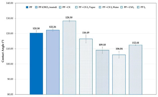 Changes in the wettability of the CX-loaded films, consistent with the presence of iodine, were observed as well (Figure 10). In Figure 10, the contact angle values for the embedded PP (Figure 10) samples and unmodified are compared. For PP dipped in the CX solution at 5%, the SCA value is much higher than that of the unmodified polyolefin. This agrees with the lower wettability due to the CX hydrophobicity. The SCA of polyolefin film portions loaded with CX/iodine complex decreased in agreement with the presence of the iodine.