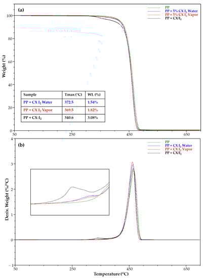 (a) TGA and (b) DTG of PP strip samples unmodified and embedded with CX iodine complex.