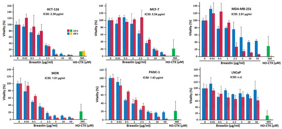 For comparison, we also exemplarily tested cell lines derived from solid tumors. The results of six carcinoma cell lines treated with Breastin are shown in Figure 5. In five cell lines, Breastin was active and we obtained IC50 values ranging from 1.01 to 5.54 µg/mL. Another cell line (LNCaP) was not responsive to Breastin and an IC50 value could not be calculated, even up to the highest concentration of 50 µg/mL. Furthermore, we compared the effects of incubation with Breastin for 24 h and 48 h. We did not observe an increased growth inhibition after 48 h compared to 24 h, indicating that shorter incubation might be sufficient to exert Breastin’s effect.