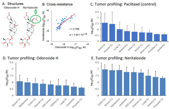 Tumor type and cross-resistance profiling of odoroside H and neritaloside in response to standard anticancer drugs. (A) Chemical structures; (B) cross-resistance between these two drugs based on their log10IC50 values in the NCI cell lines; tumor profiling for (C) paclitaxel (control drug), (D) odoroside H, and (E) neritaloside based on the log10IC50 values of the NCI panel (mean ± SD).