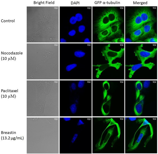 U2OS human osteosarcoma cells expressing α-tubulin-GFP were treated with Breastin (13.2 µg/mL) for 24 h to study the impact of Breastin on microtubules. Paclitaxel (10 µM) and nocodazole (10 µM) were taken as positive controls. As shown in Figure 7, tubulin was perfectly polymerized in control cells. In fact, tubulin was distributed along the cytoplasm as a thick intracellular network. By contrast, a stiff tubulin network was observed in Breastin-treated cells. This result was comparable to paclitaxel-treated cells. Unlike nocodazole, which extensively disintegrated the tubulin network, Breastin and paclitaxel increased the rigidity of microtubules at the boundaries. These results provide evidence that Breastin, just like paclitaxel, enhances tubulin polymerization.