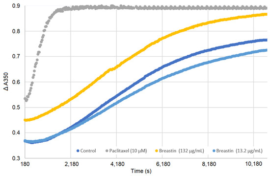 Enhancement of tubulin polymerization by Breastin. Tubulin was incubated with DMSO (negative control), Breastin (13.2 and 132 µg/mL), and paclitaxel (10 µM) at 37 °C. Optical density was determined every 30 s for 3 h. A shift to the upper left compared to DMSO reflected an increase in microtubule polymerization.