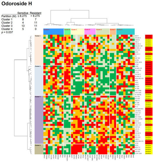 We analyzed the protein expression profiles using hierarchical cluster analysis (Ward method). The cellular expression of these 40 proteins was assembled in the first dimension, and the log10IC50 values for the two compounds in the second dimension led to two-dimensional color-coded heat maps. For odoroside H, four major clusters were obtained for the 59 tumor cell lines (clusters 1–4), and seven clusters were obtained for the 40 proteins (clusters A–G) (Figure 11). As a next step, we addressed the question of whether the distribution of sensitive and resistant cell lines was statistically different between the cell line clusters. The cell lines were defined as being sensitive or resistant to odoroside H if their log10IC50 values were smaller or larger than the median values across all 59 cell lines. Indeed, we observed that the distribution of sensitive and resistant cell lines was significantly different (p = 0.037, χ2).