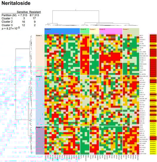 For neritaloside, we found three clusters for the cell lines (clusters 1–3) and another four clusters for the proteins (Figure 12). The distribution of sensitive and resistant cell lines was also statistically different between the cell line clusters (p = 8.27 × 10−5, χ2 test).