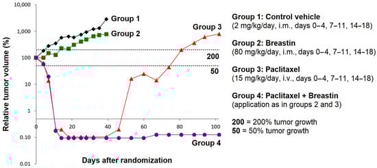 Finally, we were interested in whether Breastin can inhibit cancer cells not only in vitro but also in animals. For this reason, we used a tumor xenograft model. MAXF 401 cells were transplanted into nude mice. After an initial induction growth phase of MAXF 401 cells for 24 days, the mice were treated with Breastin (80 mg/kg/day, group 2), paclitaxel (15 mg/kg/day, group 3), Breastin plus paclitaxel (same concentrations, group 4), or vehicle control (group 1). The results are shown in Figure 13. On day 0, the tumor size was defined as 100%. Within the following 39 days, the untreated tumors grew from 100% to 2836%, while the Breastin-treated tumors grew only to 770%. Paclitaxel treatment as well as the combination treatment with paclitaxel plus Breastin decreased the tumor size from 100% to 0.1%. After day 39, the paclitaxel-treated tumors became refractory and grew from 0.1% to 801% on day 102. In contrast, the tumors treated with paclitaxel plus Breastin did not become refractory at all.