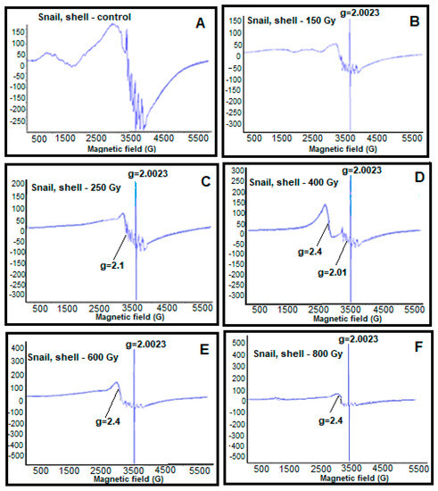 EPR spectra of shell parts of the control and irradiated at different doses of old snails. (A) control, (B) 150 Gy, (C) 250 Gy, (D) 400 Gy, (E) 600 Gy, and (F) 800 Gy.