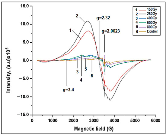 Then, EPR spectra of control and irradiated samples were recorded in a wide range of magnetic fields (500–5500 G). It should be noted that consecutive measurements were performed at least five times. Figure 1 shows the EPR spectra of shell parts of the control and irradiated old snails at different doses.