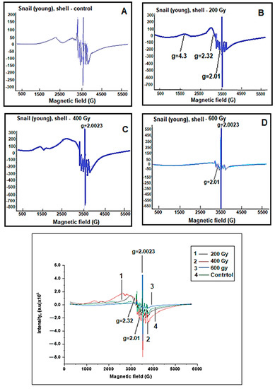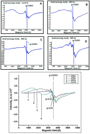 EPR spectra of body parts of the control and irradiated at different doses of young grape snails. (A) Control, (B) 200 Gy, (C) 400 Gy, (D) 600 Gy.