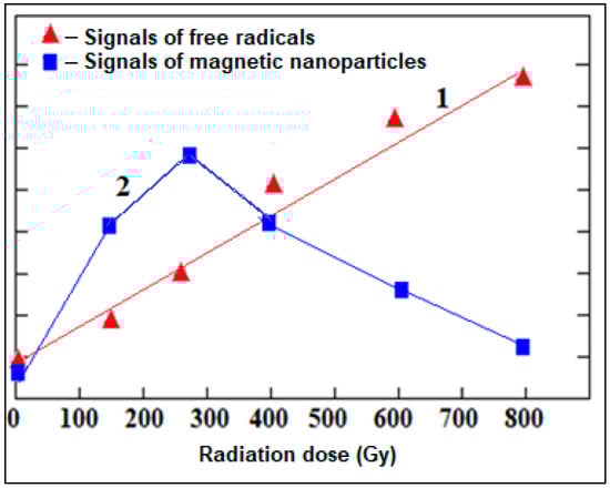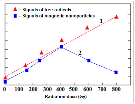 Dependence of the intensities of free radical signals (1) and broad EPR signals characterizing magnetic iron oxide nanoparticles (2) recorded in the shell parts of grape snails on the radiation dose.