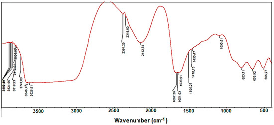 In addition, the mucin secreted by grape snails with shells was studied by the infrared (IR) spectroscopy method (Figure 7). The quality of the extracted mucin depends on many factors: temperature, season, and diet of the snail. The study of snail mucin is of great interest. The snails release mucin during times of stress or injury. As a complicated biological complex, mucin increases the regeneration properties of the epidermis, enriches the cells of the deep layers of the skin with water, fights inflammation, and acts as a highly effective natural antioxidant. Mucin is also used for cosmetic products.