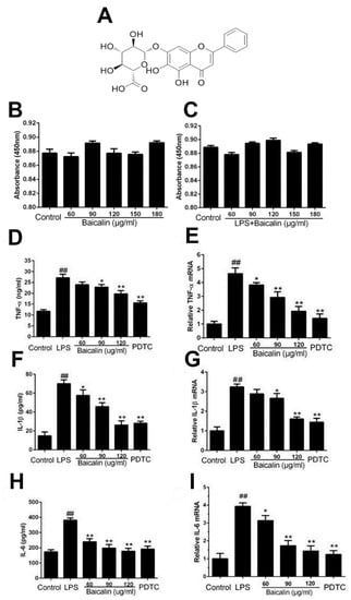 Effect of baicalin on the cell viability and inflammatory cytokines. (A) Baicalin chemical structure. (B,C) Effect of baicalin on the cell viability. Cells were cultured with baicalin (0–180 μg/mL) in the absence or presence of LPS (4 μg/mL) for 18 h. (D) The content of TNF-α. (E) The mRNA level of TNF-α. (F) The content of IL-1β. (G) The mRNA level of IL-1β. (H) The content of IL-6. (I) The mRNA level of IL-6. The values represent mean ± SEM of three independent experiments, and differences between mean values were assessed by Student’s t-test. ## p < 0.01 vs. control group; * p < 0.05 vs. LPS: ** p < 0.01 vs. LPS.
