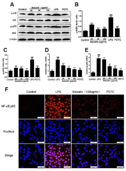 The effects of baicalin on the generation of inflammatory cytokines were determined using qRT-PCR and ELISA. Compared with the control group, LPS observably enhanced the contents of TNF-α, IL-1β, and IL-6, whereas their levels were remarkably lower in the baicalin-treated groups (60, 90, and 120 μg/mL). The results of qRT-PCR show the same dose-independent tendency as those of ELISA, which clearly demonstrate the inflammation-relieving effects of baicalin (Figure 1D–I).