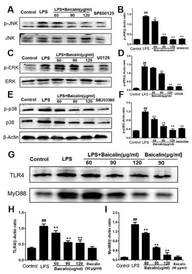 Effect of baicalin on protein expression in MAPK and TLR4 pathway of RAW 264.7 cells. Cells were treated with LPS (4 μg/mL), baicalin (60, 90, and 120 μg/mL), SP600125 (10 μM), U0126 (10 μM), or SB203580 (10 μM). (A,B) Protein expression of p-JNK and JNK; (C,D) protein expression of p-ERK and ERK. (E,F) Protein expression of p-p38 and p38; (G–I) protein expression of TLR4 and MyD88. ## p < 0.01 vs. control; * p < 0.05 vs. LPS; ** p < 0.01 vs. LPS.
