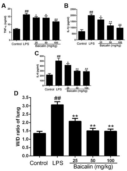 Effect of baicalin on the TNF-α, IL-1β, and IL-6 levels in BALF and lung wet-to-dry weight (W/D) ratio of LPS-induced ALI mice. LPS + baicalin group mice (n = 6 per group) were given an intraperitoneal injection of baicalin 1 h prior to administration of LPS. After 12 h, BALF was harvested for the analysis of cytokine levels. The values presented are the means ± SEM. (A) The content of TNF-α; (B) the content of IL-1β; (C) the content of IL-6; (D) the W/D ratio of lung in LPS- and baicalin-induced mice. ## p < 0.01 vs. control; * p < 0.05 vs. LPS; ** p < 0.01 vs. LPS.