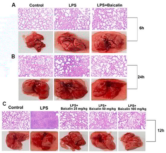 Effect of baicalin on lung tissue histopathological changes in LPS-induced ALI mice. LPS + baicalin group mice (n = 6 per group) were given an intraperitoneal injection of baicalin (25, 50, and 100 mg/kg) 1 h prior to LPS administration. After 6 h, 12 h, and 24 h, lungs were harvested for measuring histopathological changes. To confirm pathological changes in lung tissues, hematoxylin–eosin (H&E) staining was performed: (A) Mice lung treated with LPS and baicalin for 6 h; (B) mice lung treated with LPS and baicalin for 24 h; (C) mice lung treated with LPS and baicalin for 12 h; the resolution was ×200.
