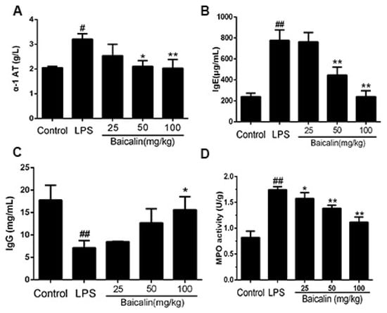 Effect of baicalin on the contents of α-1 AT, IgE, IgG, and MPO in LPS-induced ALI mice. LPS + baicalin group mice (n = 6 per group) were given an intraperitoneal injection of baicalin (25, 50, and 100 mg/kg) 1 h prior to LPS administration. After 12 h, the blood was collected. (A) α-1 AT content of each group; (B) IgE content of each group; (C) IgG content of each group; (D) MPO activities of each group. The values presented are the means ± SEM (n = 6 in each group). # p < 0.05 vs. control group; ## p < 0.01 vs. control group; * p < 0.05 vs. LPS; ** p < 0.01 vs. LPS.
