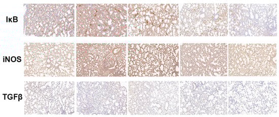 An immunohistochemical technique was applied to detect the expression of IκB, iNOS, and TGF-β. The results demonstrated that after the LPS was induced, the protein expression of IκB, iNOS, and TGF-β were increased compared with the control mice. The baicalin pre-treatment reduced the ascending protein expression (Figure 7).