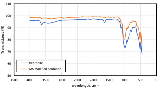 FTIR spectra of bentonite and MS (0.4 wt%) modified bentonite.