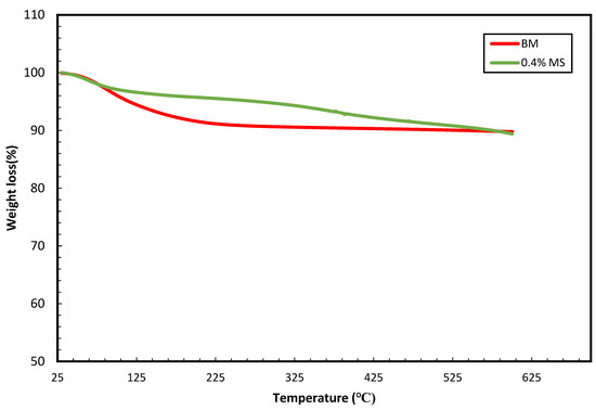 The functional group of the formulated drilling mud was determined using Fourier Transform Infrared (FTIR). The transmittance was measured as a function of the wavelength. The transmittance is the fraction of incident light that passes through the sample and comes out on the other side. Moreover, the thermal stability of the mud was investigated via a thermogravimetric analyzer (TGA), PerkinElmer, Waltham, MA, USA. Before the TGA measurement, a purge gas of nitrogen was introduced at the rate of 20 mL/min. Subsequently, the procedure for TGA measurement was executed by placing a small quantity (5 mg) of the dry WBM and MS–WBM on a quartz pan of the TGA and heating the sample from 25 °C to 600 °C at the rate of 10 °C/min.
