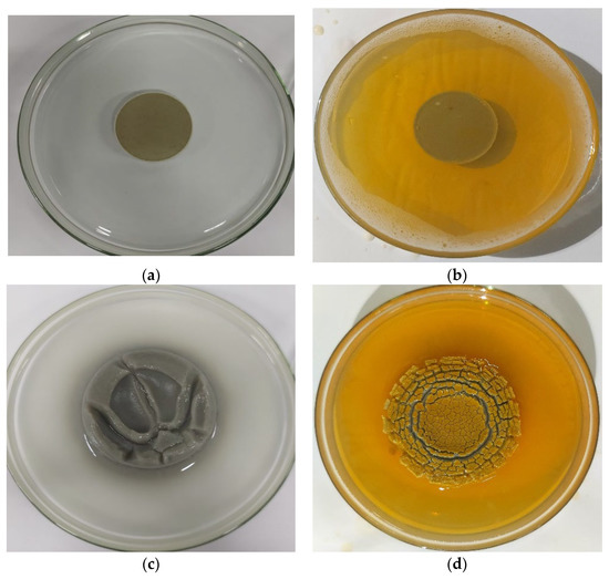 (a,b) show the bentonite wafers in DI water and MS solution at the start. (c,d) show the bentonite wafer in DI water and 0.4 wt% MS after 24 h.