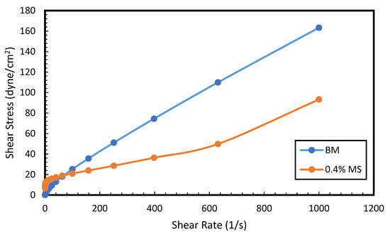 Shear stress versus shear rate (i) base mud, (ii) 0.4 wt% MS. (Temperature = 25 °C).