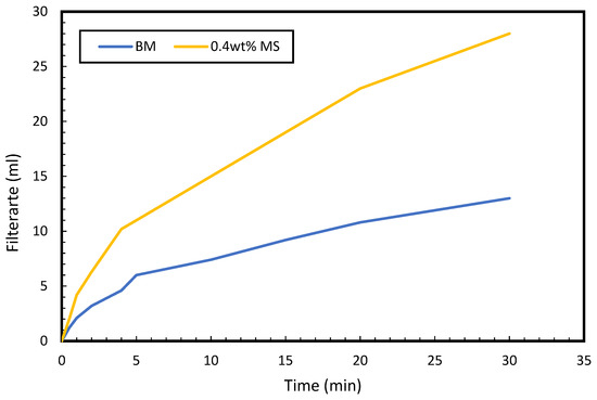 An important property of drilling mud formulation is its filtration property. It indicates the amount of filtrate loss volume from the drilling fluid to the reservoir formation during the drilling operation. Accurate control of filtrate loss can prevent or lessen wall sticking and, in some cases, enhance wellbore stability [43]. The filtration property of the conventional WBM and MS–WBM were measured and shown in Figure 12. The surfactant-based mud displays more filtration volume over time compared to the conventional WBM. At 30 min, the filtrate volume of 28 mL and 12 mL was recorded for 0.4 wt% MS–WBM and conventional WBM, respectively. The higher filtrate volume of the MS–WBM is due to the release of water from the mud. The well-dispersed, bentonite-based drilling mud results in low fluid loss as observed in base mud. Upon addition of surfactant to the base, it inhibits the swelling and dispersion of the bentonite in water. The absorption capacity of the bentonite reduces and water releasing capacity increases upon the addition of surfactant.