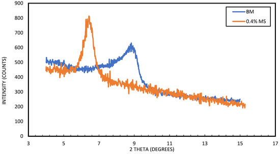 The XRD analysis of the crystallographic structure of base mud and 0.4 wt% MS–WBM is shown in Figure 14. The addition of magnetic surfactant to the base mud caused an increase in the basal d-spacing of the clay interlayer spacing. The basal spacing increased from 12.2 Å to 13.62 Å. This can be attributed to the intercalation of the interstices of the bentonite clay layers which resulted in the inhibition of water molecules and prevented the swelling behavior of the clay.