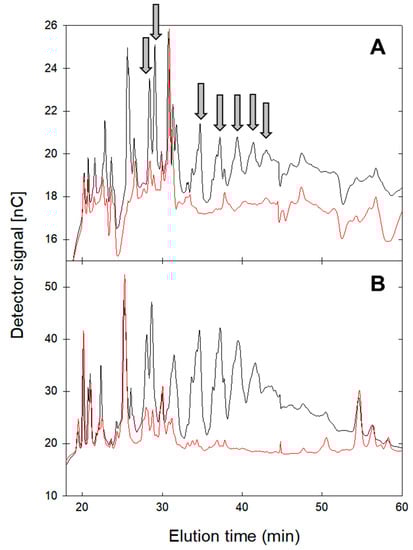 HPAEC-PAD profiles of oligosaccharides after hydrolysis of amylose (A) and potato starch (B) by α- and β-amylases. Amylose and potato starch were treated with GlgB (black line); untreated amylose and potato starch served as control (red line). Oligosaccharides that were present after GlgB treatment in treated amylose and potato starch are indicated with an arrow. Monosaccharides eluting between 3 and 10 min are not shown.