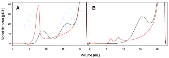 Size distribution of potato starch (A) and wheat starch (B) analyzed by HPSEC-RI. Starches were treated with GlgB (black line) or not (red line).