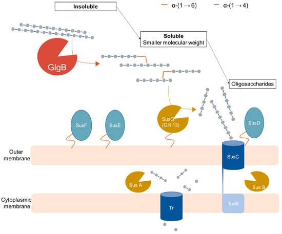 Schematic diagram of the putative role of glucan-branching enzyme (GlgB) in colonic starch degradation with the starch utilization system (Sus) of Gram-negative Bacteroides. The glucan-branching enzyme (GlgB) solubilizes amylose into branched structure (this study) that can be subsequently degraded by Bacteroides amylolytic system [1,2,10,11,12,31,32]. Sus G: extracellular amylase (neopullulanse); Sus D, E & F: protein involved in binding starch molecules; Sus C: TonB-dependent transporter (TBDT) that transport oligosaccharides molecules into periplasm; Sus A & B: periplasmic amylolytic enzymes (GH13 & GH97); Tr: Transporter that transports small saccharides into cytoplasm; TonB: cytoplasmic transmembrane complex.