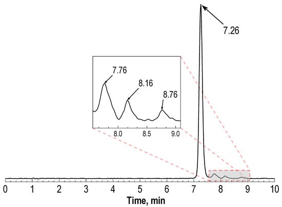 Typical radio-HPLC chromatogram of [177Lu]Lu-PSMA-617 preparation obtained via HPLC method 3 (see Section 4): sample volume—1 mL, 177Lu activity in the sample—150 MBq, 10 μg of PSMA-617, pH 4.5, synthesis at 95 °C for 30 min (for corresponding radio-TLC chromatograms, see Supplementary Materials Figure S1).