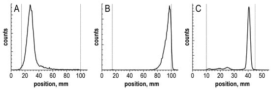 Radio-TLC chromatograms of 4.8 GBq [177Lu]Lu-PSMA-617 preparation (sample volume—1 mL, 100 μg of PSMA-617, pH 4.5, synthesis at 95 °C for 30 min) obtained with different TLC methods (see Section 4): (A) method 1 (Rf for [177Lu]Lu-PSMA-617 is 0.15 ± 0.05), (B) method 2 (Rf for [177Lu]Lu-PSMA-617 is 0.95 ± 0.05), (C) method 3 (Rf for [177Lu]Lu-PSMA-617 is 0.85 ± 0.05).