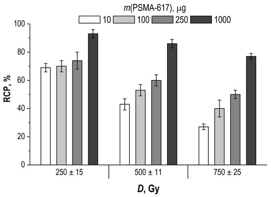 Influence of PSMA-617 precursor amount in the sample on the degree of radiolitic degradation of [177Lu]Lu-PSMA-617 at different absorbed doses (samples volume—1 mL, 177Lu activity in the sample—450 MBq, pH 4.5, C(Na-acetate) = 0.03 mol/L; RCP value is presented as mean ± SD, n = 3).