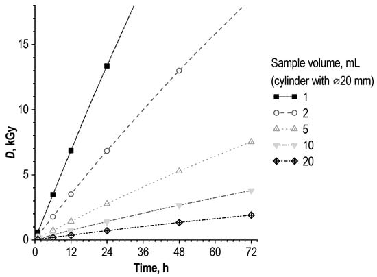 Based on the results of computer modeling (Geant4 with PENELOPE physics list) for an aqueous solution in the geometry of a cylinder with a diameter of 20 mm (simulating the geometry of a liquid in a standard injection vial ISO 8362-1:2018), as well as Fricke chemical dosimetry [62], the absorbed dose value over time significantly depends on the sample volume (volume of the cylinder)—Figure 7.