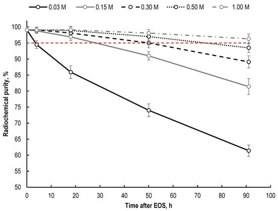 Time dependences of the decrease in [177Lu]Lu-PSMA-617 radiochemical purity on the concentration of sodium acetate in the final preparation (sample volume—1 mL, 177Lu activity in each sample—100 MBq, 100 μg of PSMA-617, pH 4.5; RCP value is presented as mean ± SD, n = 3).