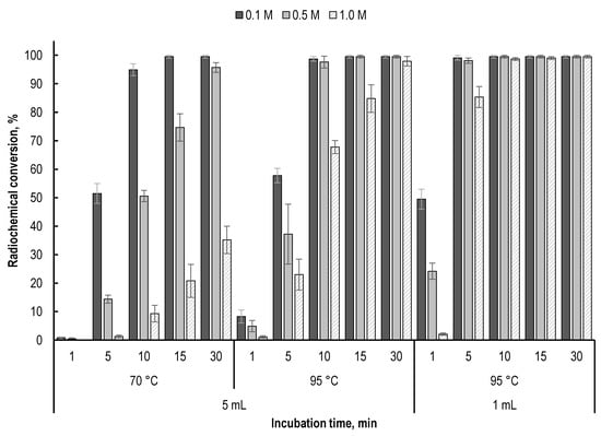 Although acetate ions are very weak free-radical scavengers, an increase in their concentration in the sample can suppress radioconjugate degradation [27]. If the acidity of the preparation is provided solely by the hydrochloric acid of lutetium-177 solution (0.04–0.05 M HCl), then the maximum concentration of sodium acetate (when the required pH level is reached) is only about 0.08–0.1 M. In the case of using an acetate buffer solution or the presence of additional acid additives in the sample (such as gentisic or ascorbic acids), the final concentration of sodium acetate can be significantly increased. It should be noted that an increase in the concentration of sodium acetate can affect the kinetics of lutetium-177 incorporation into the PSMA-617 structure; however, this effect becomes noticeable only at low synthesis temperatures and/or large volumes of the reaction mixture (Figure 10).