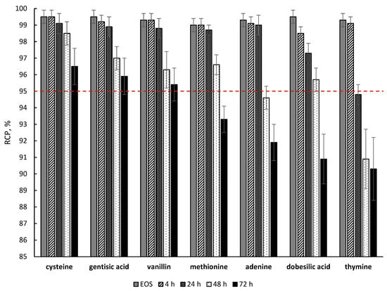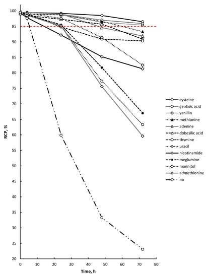 Among all the studied compounds, cysteine, gentisic acid, and vanillin showed the best radioprotective function in relation to the [177Lu]Lu-PSMA-617 molecule (with a statistically significant difference of p < 0.05 compared to the next substance in order—methionine—and p < 0.01 compared to all other studied substances) after 72 h of storage. It is noteworthy that all three substances individually showed almost the same RCP value for [177Lu]Lu-PSMA-617 after 72 h of storage (96.5 ± 1.0%, 95.9 ± 1.1% and 95.4 ± 0.9% for cysteine, gentisic acid and vanillin, respectively (p > 0.05)). When comparing the effectiveness of quenchers at earlier time points (48 h after EOS), cysteine was found to be the most effective substance (98.6 ± 0.7%, 97.0 ± 0.6% and 96.3 ± 1.1% for cysteine, gentisic acid and vanillin, respectively).
